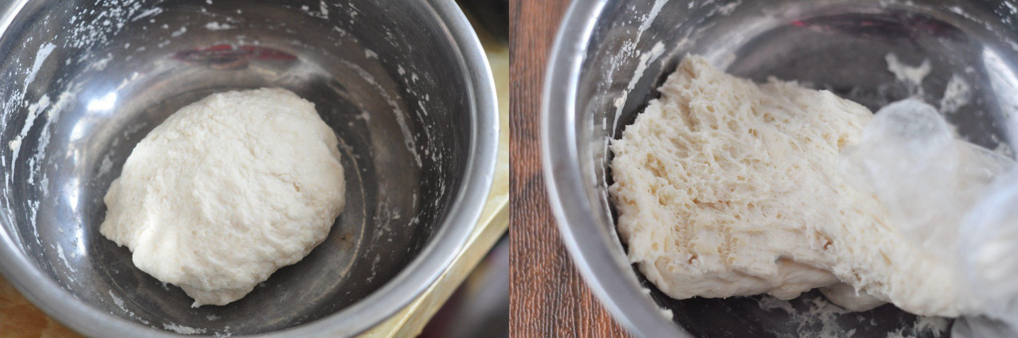 Cho bột mì, nước chín và men nở khô vào thố trộn đều sau đó nhào thành khối dẻo mịn. Ủ bột ở nhiệt độ phòng trong khoảng 40 phút hoặc cho đến khi kéo bột lên tạo thành hình tổ ong.