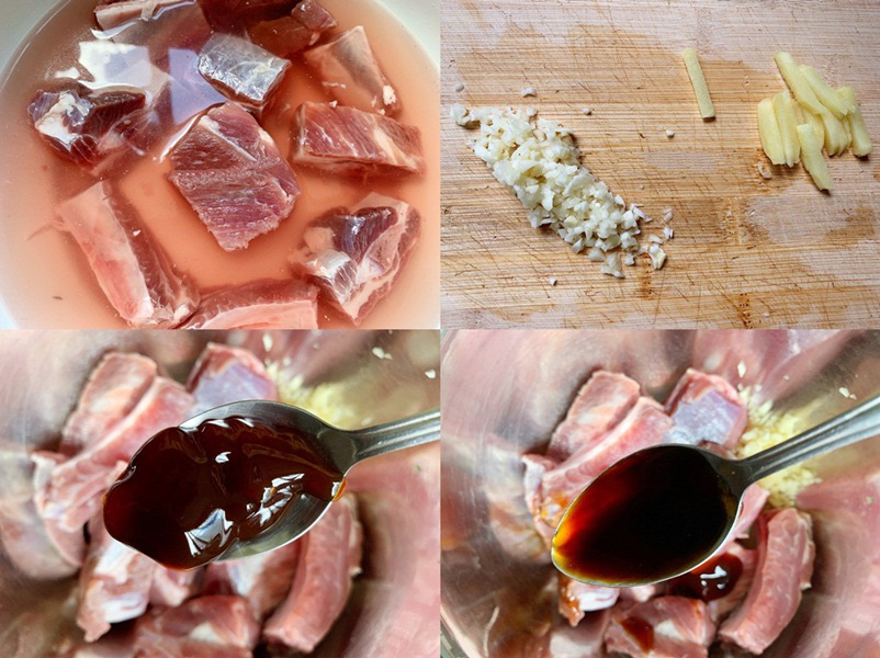Sườn rửa sạch, chặt miếng vừa ăn. Ngâm sườn trong nước khoảng nửa giờ cho sườn ra bớt máu. Gừng thái sợi, tỏi băm nhỏ. Cho sườn vào bát rồi thêm tỏi, gừng, rượu nấu bếp, dầu hào, nước tương vào trộn đều.